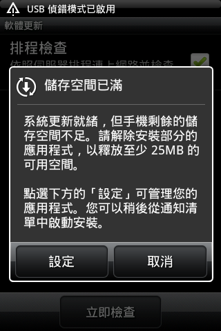 急不及待開始下載並安裝,但因為我手機的內部儲存空間太少(不足20MB),過程中出現”儲存空間已滿”的訊息,顯示要至少預留25MB的可用空間。為了完成安裝,把大型的軟件移除後便繼續,最後終於完成。