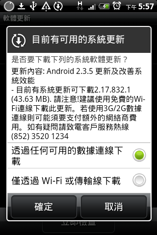 細看之下,這是Android 2.3.5的更新(原版本是2.3.4),下載容量: 43.63MB。 軟體號碼是: 2.17.832.1 , HTC Sense版本是2.1。