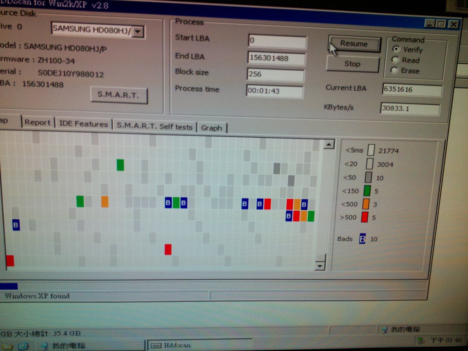 一隻嚴重bad sector 的harddisk。HDDScan 的掃瞄結果。很精彩啊!!