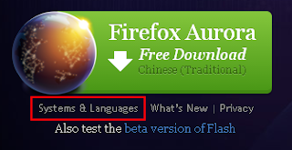 當你按下連結後,你會被帶到Firefox Aurora 的英文頁面。你可以按 "Free Download"按鍵 下的 "Systems & Languages",即可選擇你適合的語言版本和OS 平台。