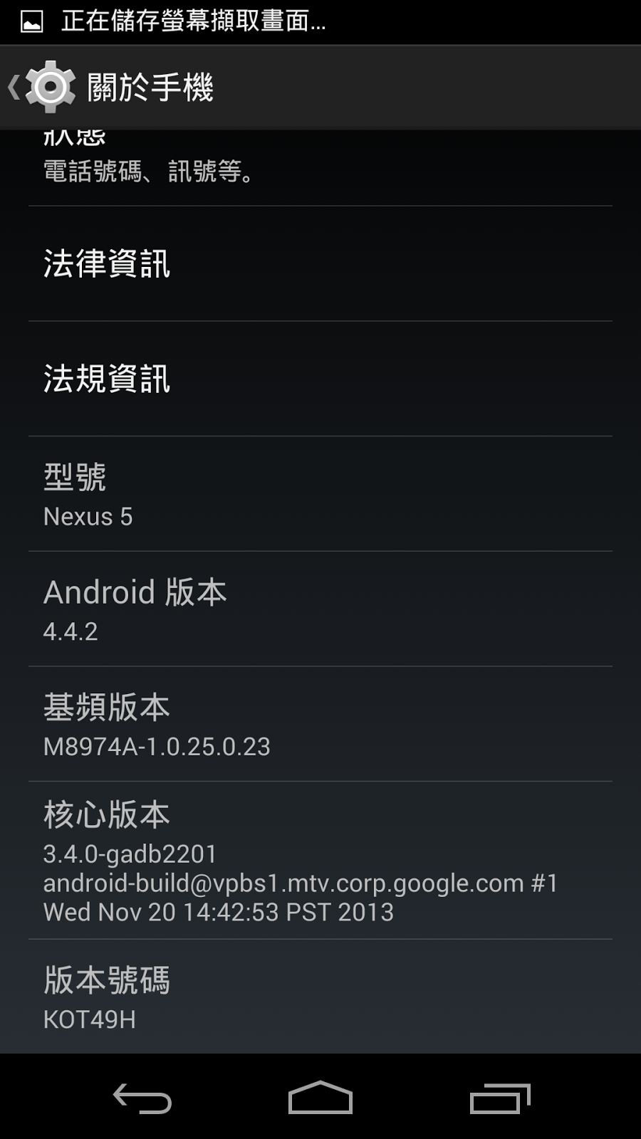 Reboot 後等待數分鐘便完成更新程序,在關於手機內可看到Android 版本已變成 4.4.2,而版本號碼則成為 KOT49H。
