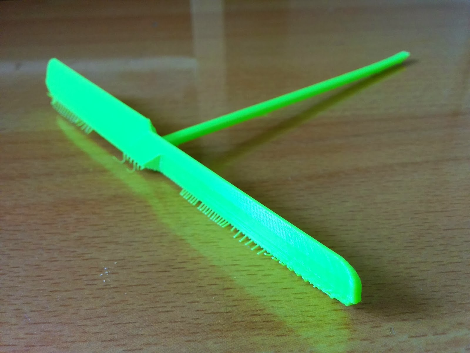 第一件3D Print的物品就是......竹蜻蜓! 我利用3D Printer 打印出的第一件完整的物品就是......竹蜻蜓。 為了可以打印出一件可以測試成品強度而又不會太浪費原料,所以選擇了竹青蜒。 因為此作品本身不是可平穩的站在平面上,所以打印時先會在製品的底部建立承托的部分。 可看到都算平均,雖然不是像倒模般細緻。 完成後只消耗了少量原料。