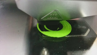 為了節省原料,我沒有把樣版完全印製出來。大家可看到它就像填顏色般,把膠一條一條的填在平台上,慢慢形成立體。製作印製用的檔案時,可以選擇宙實心還是空心的結構。如果是選擇空心,內裏會印出薄薄的垂直間隔以承托和固定製成品。