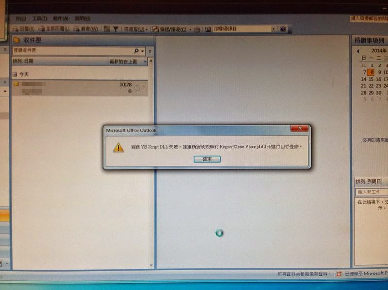 方便自己解決有關執行 Outlook 2007時出現的 "登錄 VB Script DLL 失敗。請重新安裝或執行 Regsvr32.exe Vbscript.dll 來進行自行登錄。" 錯誤訊息,特此出post。