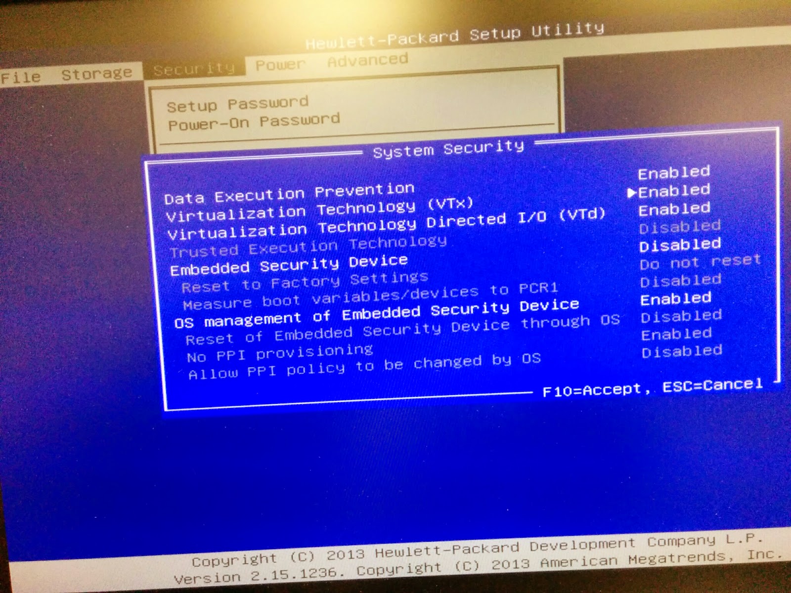 事情十分簡單,起初我以為VTx 的設定會在 "Advanced" 一欄。誰不知原來是藏在 "Security > System Security" 內裏。看看上圖便清楚了。