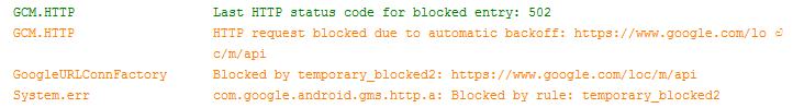 12-24 01:10:25.679: I/GCM.HTTP(1490): Last HTTP status code for blocked entry: 50212-24 01:10:25.679: W/GCM.HTTP(1490): HTTP request blocked due to automatic backoff: https://www.google.com/loc/m/api12-24 01:10:25.710: W/GoogleURLConnFactory(1647): Blocked by temporary_blocked2: https://www.google.com/loc/m/api12-24 01:10:25.710: W/System.err(1647): com.google.android.gms.http.a: Blocked by rule: temporary_blocked2