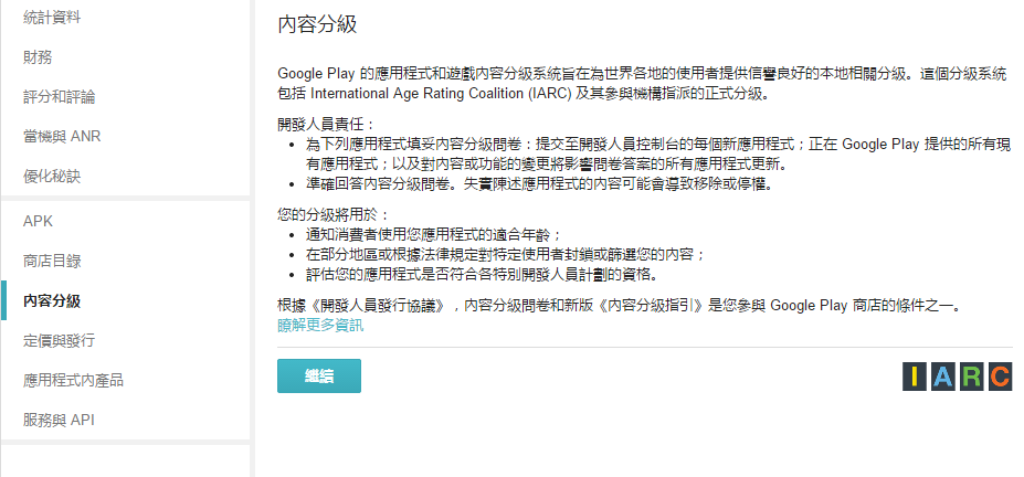 Google Play 全新分級系統 Google Play 採用新的內容分級規範,預計將於今年5月全面取代目前使用的分級標準。根據Google的資料,如果是不在任何 International Age Rating Coalition (IARC) 分級機構支援範圍內的地區,則將由 IARC 指派以年齡為依據的通用分級機制。開發人員只要完成問卷,便可即時獲得評級。