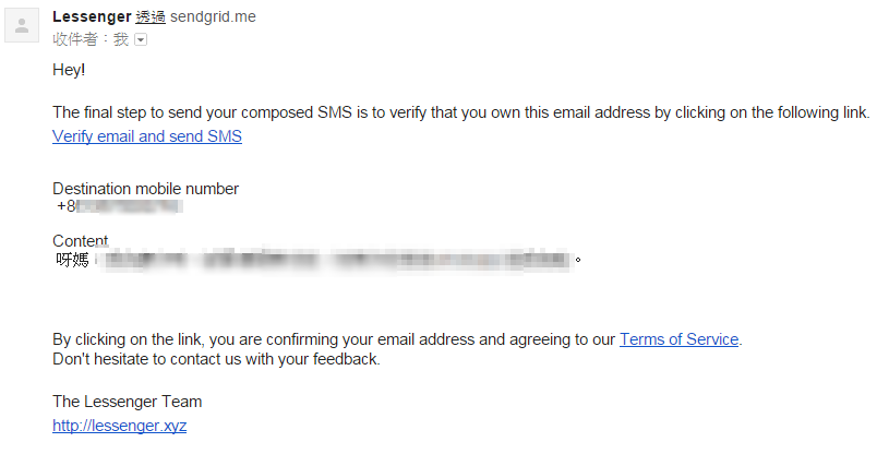 而訊息的末端會標示為"via Lessenger.xyz" ,相信是為了防止濫用服務
