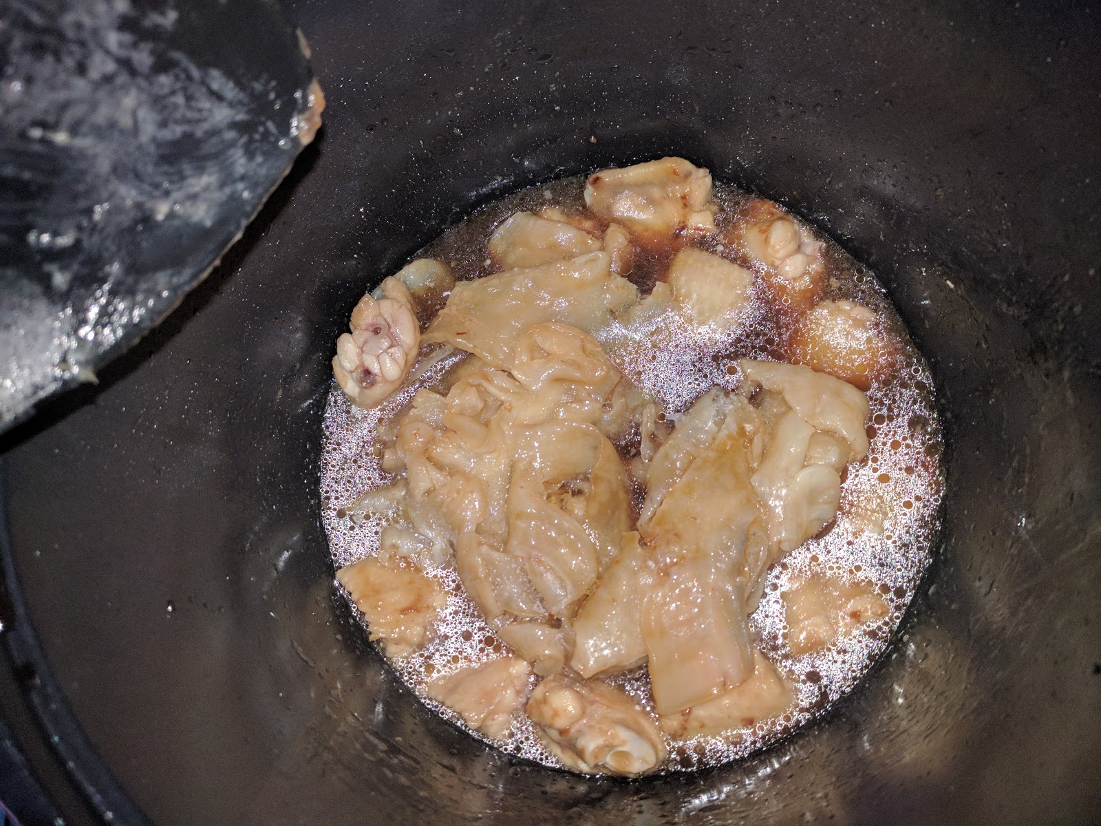雞中翼浸水溶雪後,一開二,加入生抽、砂糖、粟粉和酒各1湯匙,醃15分鐘。如果時間許可,我會醃耐點。因為我懶+想洗少個碗,所以直接在煲內醃雞翼,不過這樣做是有問題的,下面再說明。