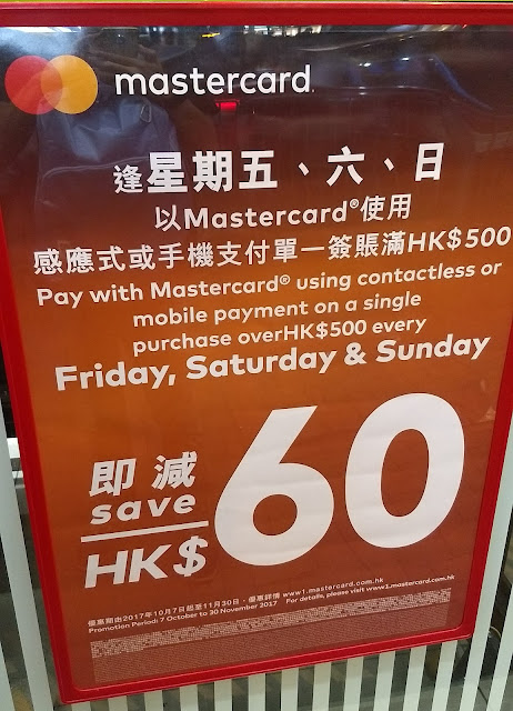 即日至2017年11月30日,逢星期五、六、日,以 Mastercard 於全港惠康超級市場、Market Place by Jasons、Jasons・Food & Living、3hreesixty、Oliver's the Delicatessen分店用感應式或手機支付單一簽賬滿HK$500,即減HK$60。