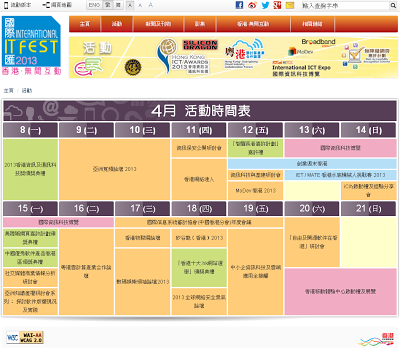 收到Email 通知香港將於 4/8/2013 至 21/4/2013舉辦首屆「國際IT匯」。抱住期待心情跟連結進入活動詳情頁面 (http://www.itfest.hk/tc/event/index.htm),反應不錯,眼前即時展示出設計精美的活動時間表。很清楚列出各活動項目的日期和名稱,項目數量不少,大約有26項。